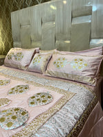 This 8-piece Block Printed Comfortor Set features exquisite handcrafted block printing on a sophisticated powder pink base. Each intricate pattern is meticulously applied using traditional artisanal techniques, ensuring no two sets are identical. The delicate color palette creates a serene bedroom atmosphere while showcasing the premium craftsmanship that discerning customers appreciate in authentic block printed textiles.
