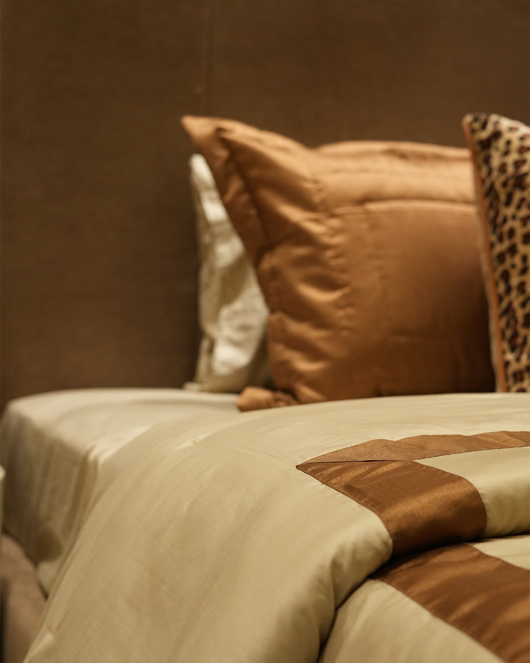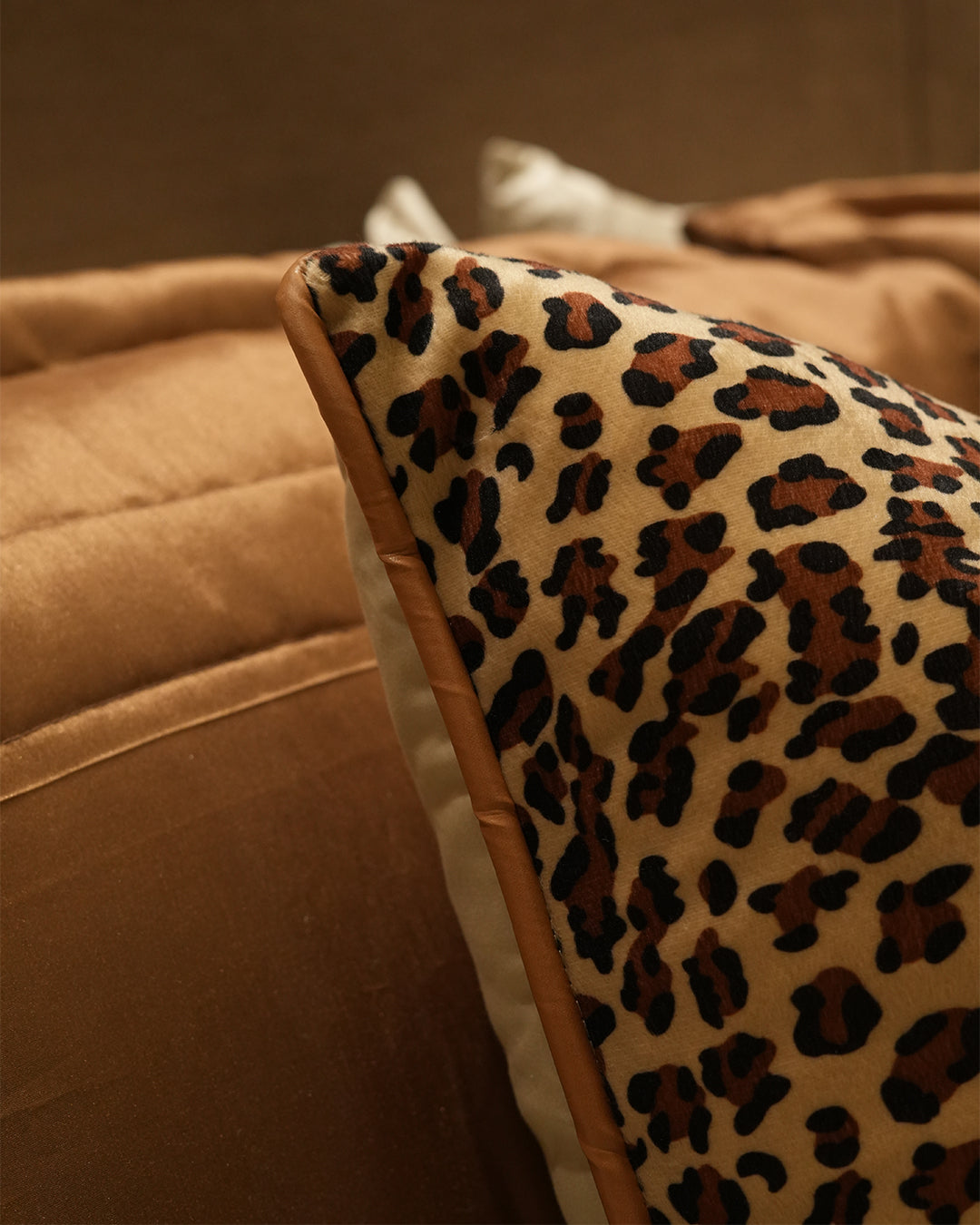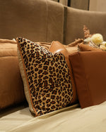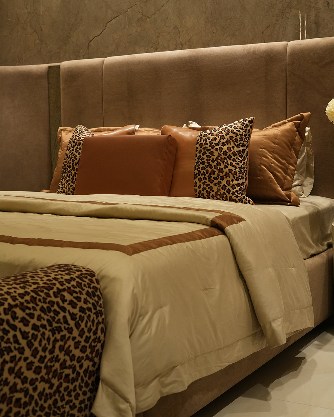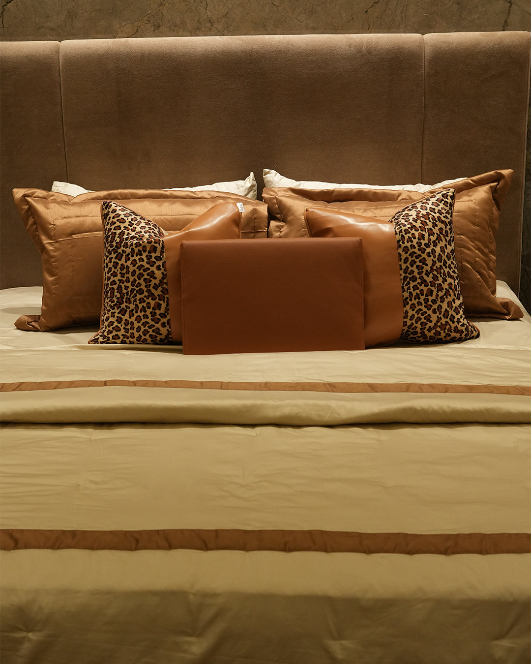 Transform your bedroom into a sanctuary of refined elegance with this exquisite 9-piece comforter set. Crafted for discerning homeowners, the collection features a striking cheetah print design paired with luxurious silk piping that adds a sophisticated edge. Premium leather patches adorn the cushions, elevating the overall aesthetic with tactile luxury. The carefully curated palette of rich brown tones creates a harmonious, symmetrical color composition that complements any upscale interior.