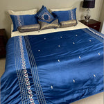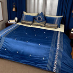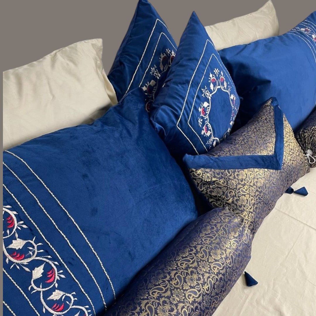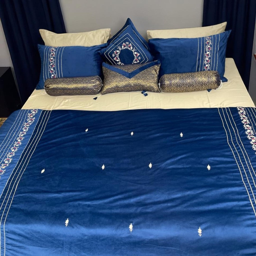 Experience luxury with this 11-piece comforter set crafted from plush velvet, featuring intricate embroidery and elegant Jamavar details on the cushions. Designed for a king-size bed, it can be easily adjusted to fit queen-size beds, offering both versatility and style. This set combines comfort and sophistication, enhancing your bedroom with rich textures and timeless craftsmanship.