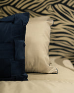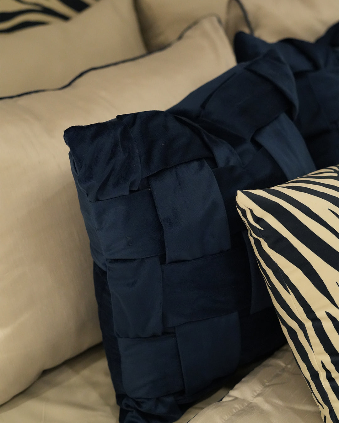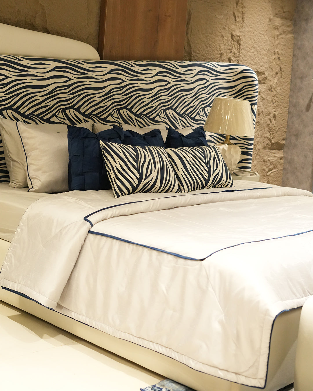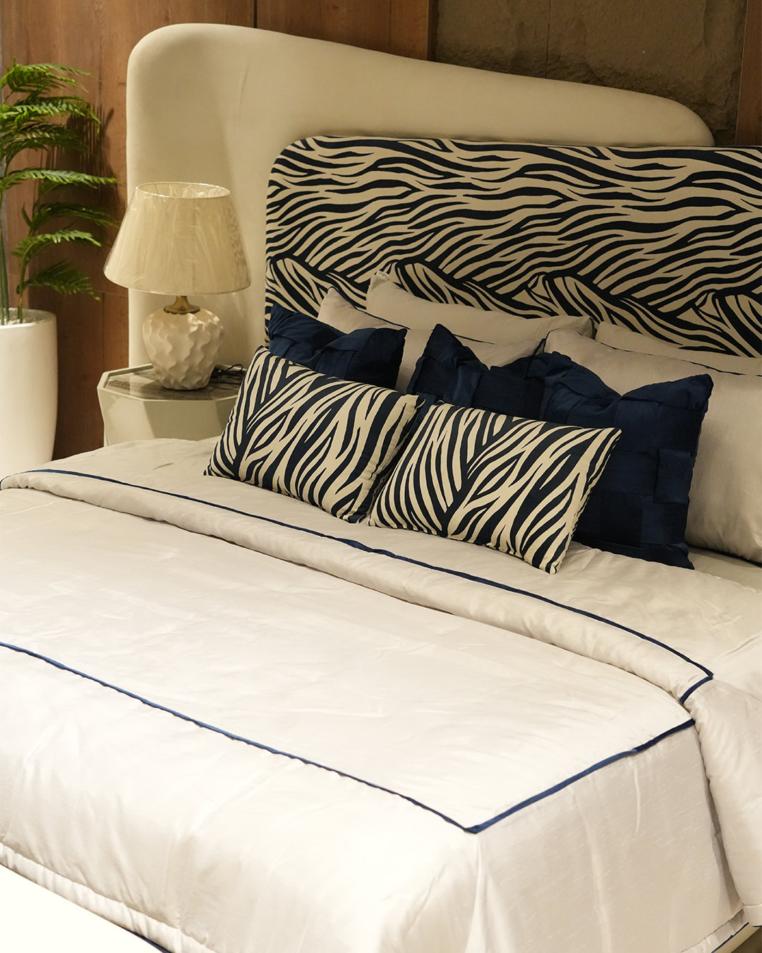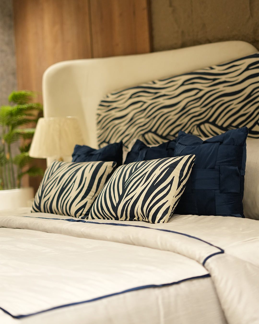 The Silk Lines Comforter Set brings refined elegance to your bedroom with a carefully curated 11-piece collection. Each piece features delicate piping details in rich blue tones, creating a sophisticated visual rhythm across the ensemble. Complementary silk cushions in matching blue add a luxurious finishing touch, elevating your sleep space with premium texture and coordinated style. This comprehensive set provides everything needed for a polished, cohesive bedroom aesthetic that balances comfort with understated luxury.