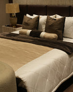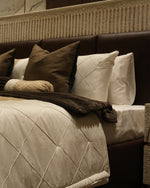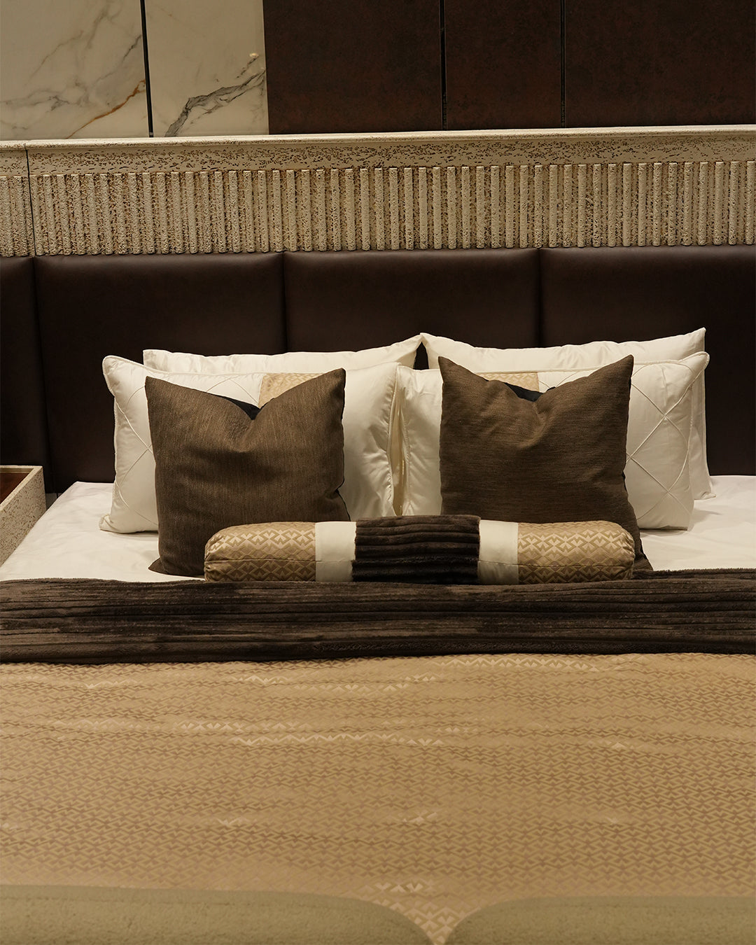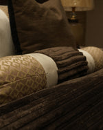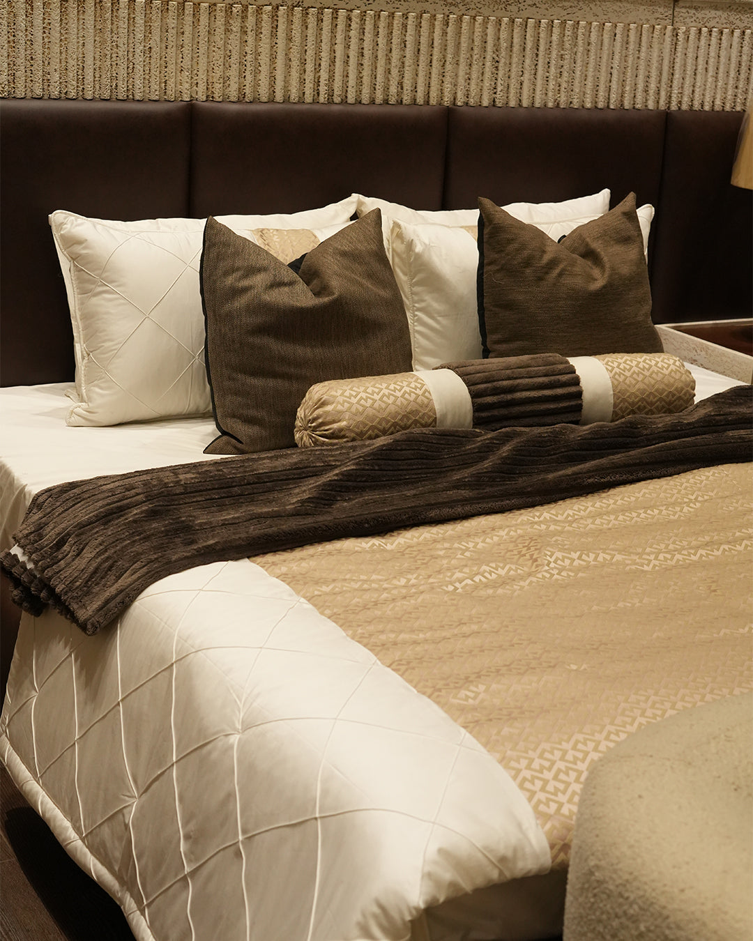 Elevate your bedroom with this luxurious 9-piece comforter set, expertly crafted in sophisticated beige and dark chocolate tones. The collection features a stunning centerpiece—an ornately designed cushion adorned with intricate hand-stitched embellishments and elegant pleats that serve as a focal point for your décor. Each piece is engineered for maximum comfort and durability, combining premium materials with refined aesthetics. Perfect for creating a cohesive, upscale bedroom sanctuary that balances style with everyday softness and warmth.