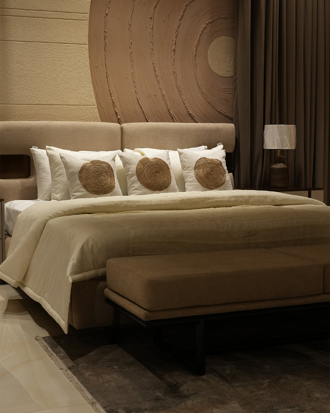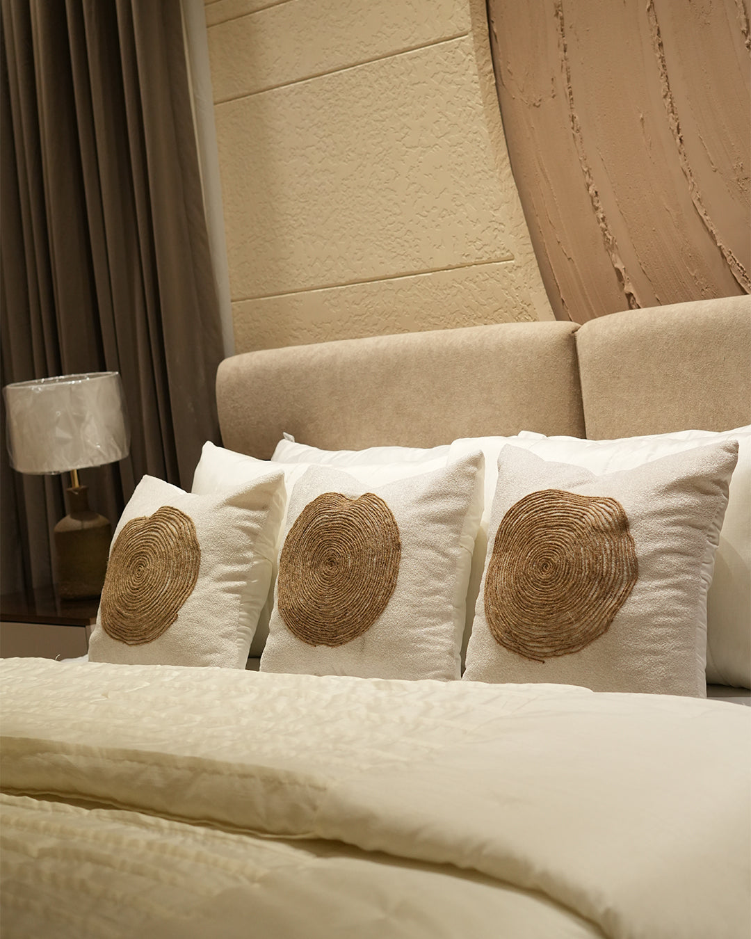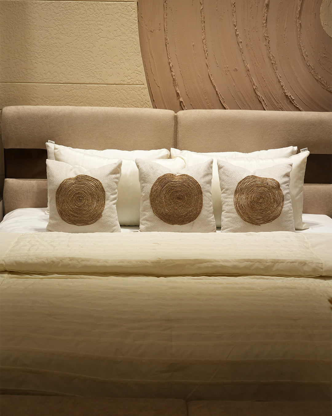Elevate your bedroom with this exquisite 9-piece comforter set, featuring elegant swirl patterns in soothing beige and off-white tones. Each piece is meticulously handcrafted, bringing artisanal quality and refined aesthetics to your space. The thoughtfully designed cushions showcase intricate swirl detailing that adds visual depth and sophistication. Perfect for those who appreciate handmade craftsmanship and timeless elegance.
