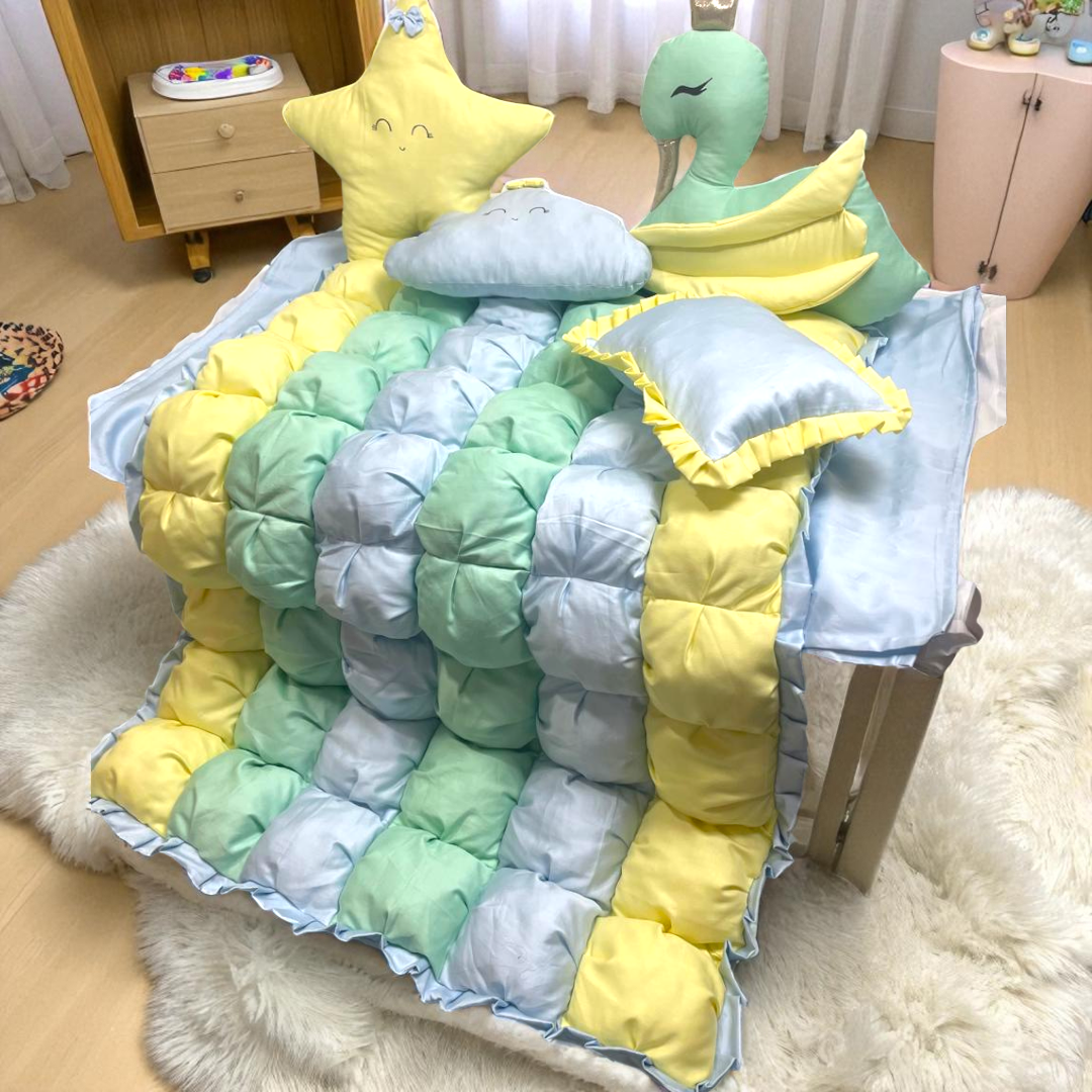 This 6-piece Baby Cot Bedding set includes four soft pillows and a warm quilt, all crafted from breathable cotton satin for comfort and durability. The quilt is generously filled with microfiber, providing cozy warmth without added weight. Featuring vibrant, multi-colored designs, this set combines practical comfort with playful aesthetics, making it an ideal choice for your baby’s sleep environment.