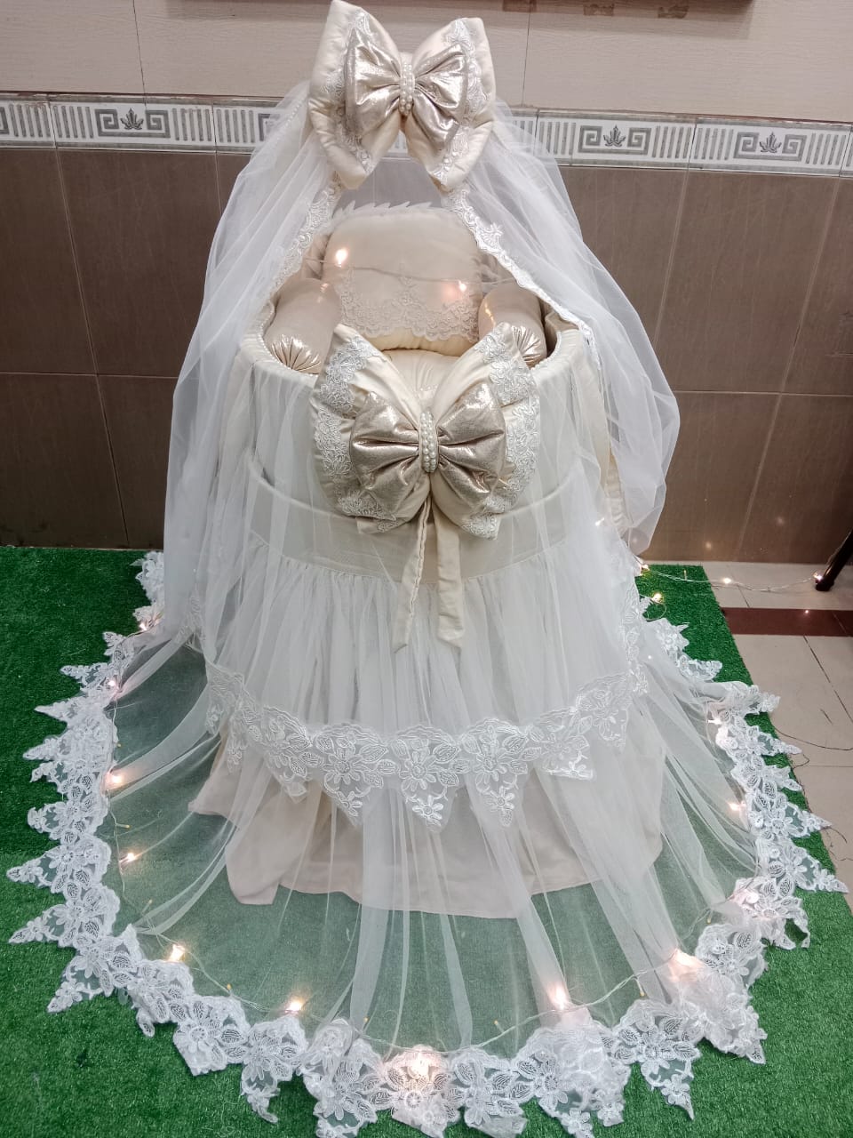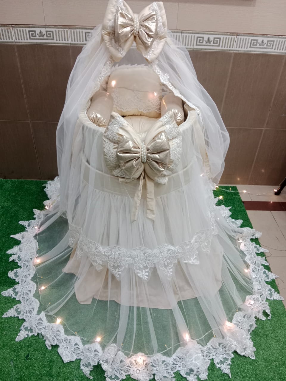 A bassinet is a small basket used as a bed for a baby. A bassinet is portable, making it easy to carry the baby around. The et ending in the bassinet is a clue that this is something small, specifically a small basket used for carrying a baby. The baby also can sleep in the bassinet.