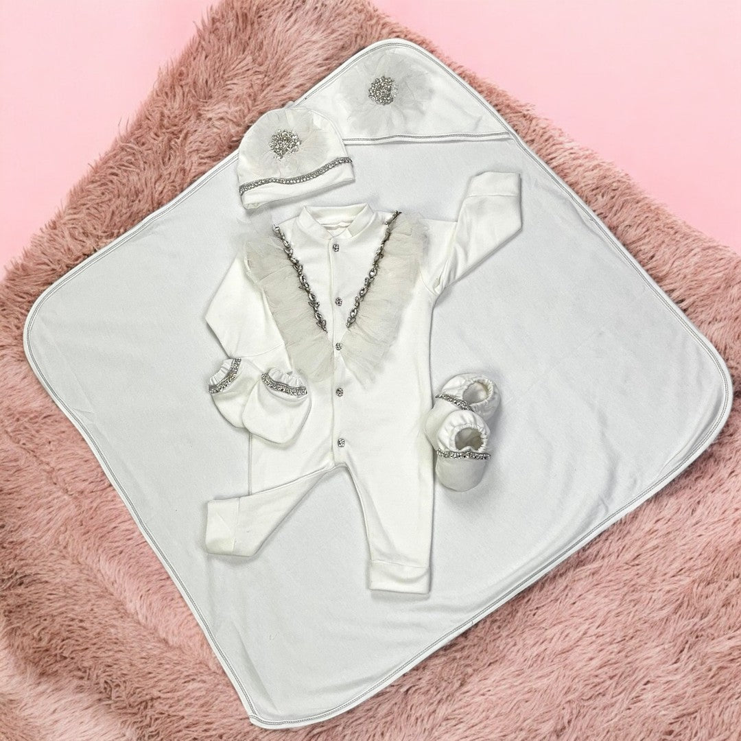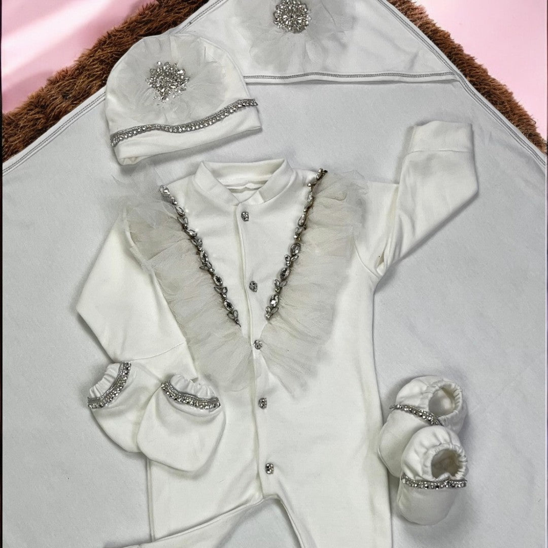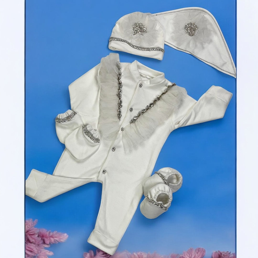 Introducing our 5 piece Baby Romper Set, perfect for newborns up to 3 months during the spring season. Each piece is embroidered for a touch of elegance. Keep your little one comfortable and stylish with this set.