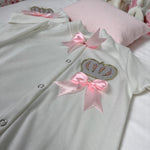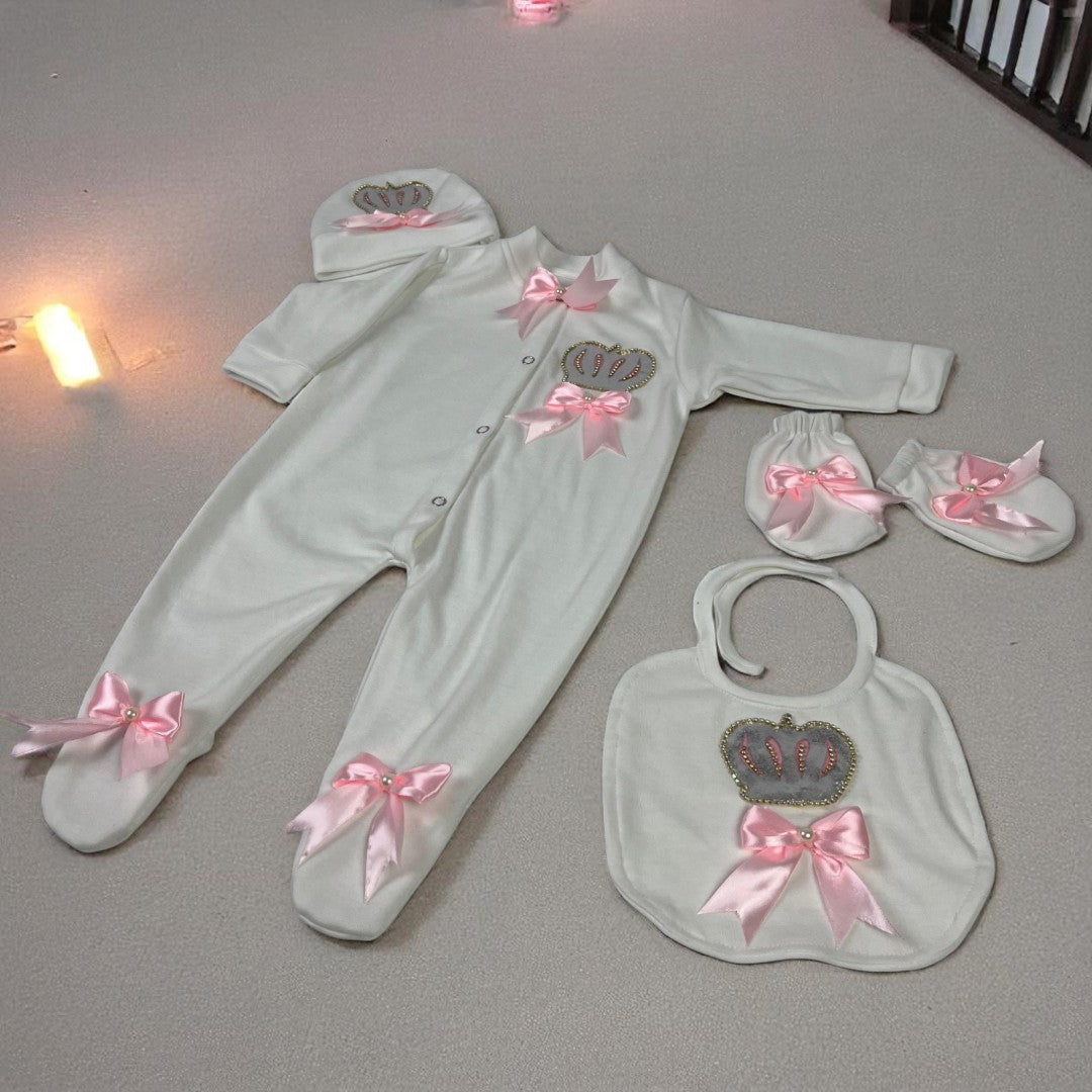 Set Includes Romper, Hand Gloves, Bibe, Cap in houseri stuff embalished with shimmer crowns