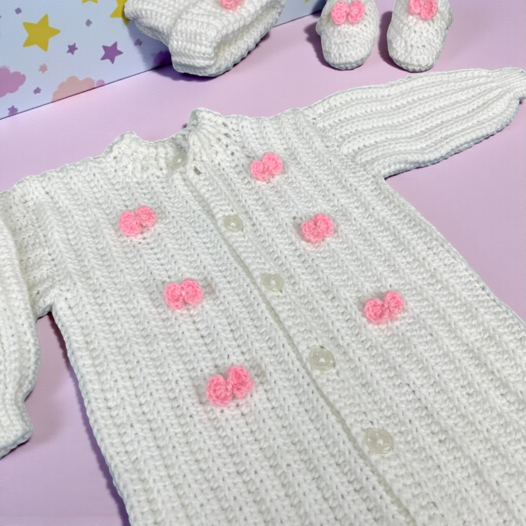 This knitted 4-piece romper set is specially designed for newborns aged 0 to 3 months, with sizing tailored to accommodate varying weights and heights. Crafted for comfort and ease, each piece provides gentle warmth and softness ideal for delicate baby skin. The set ensures flexibility and practicality, making dressing effortless for parents while keeping your baby cozy during early growth stages.