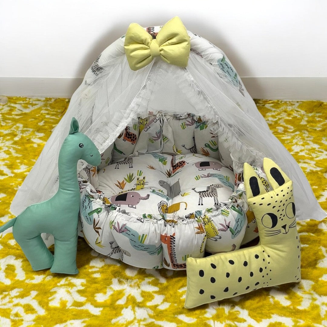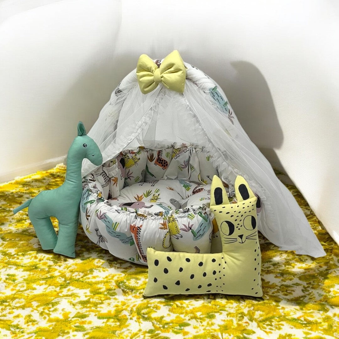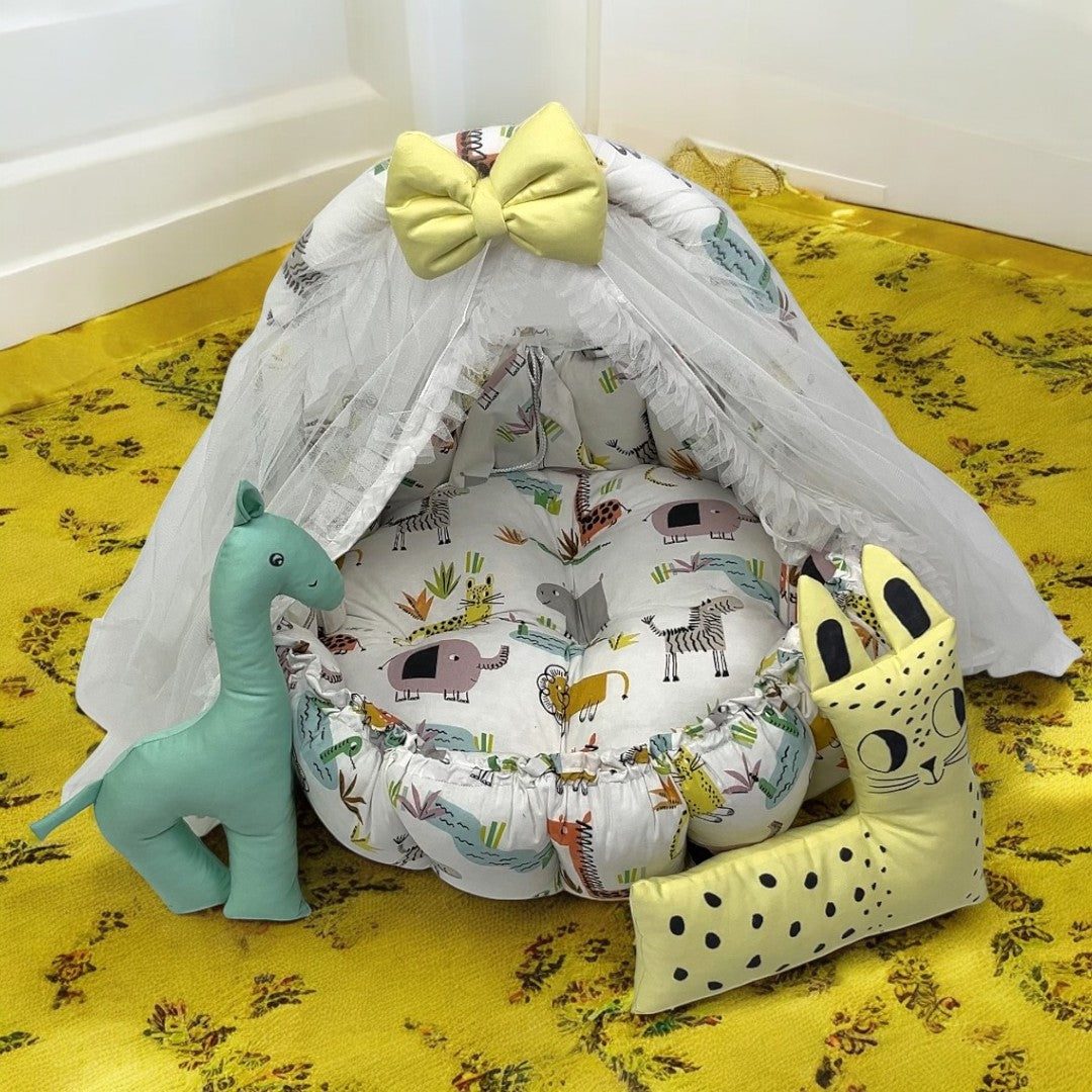 The Jungle Snuggle Bed is the perfect sleeping solution for your new born baby. This bed includes 2 pillows for added comfort and support, creating a safe and cozy environment for your little one. Experience the peace of mind that comes with our scientifically designed and expertly crafted baby snuggle bed.