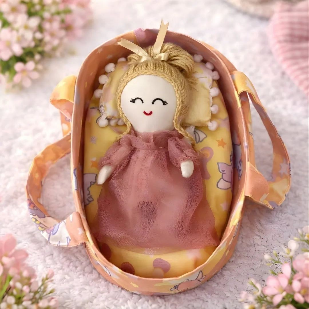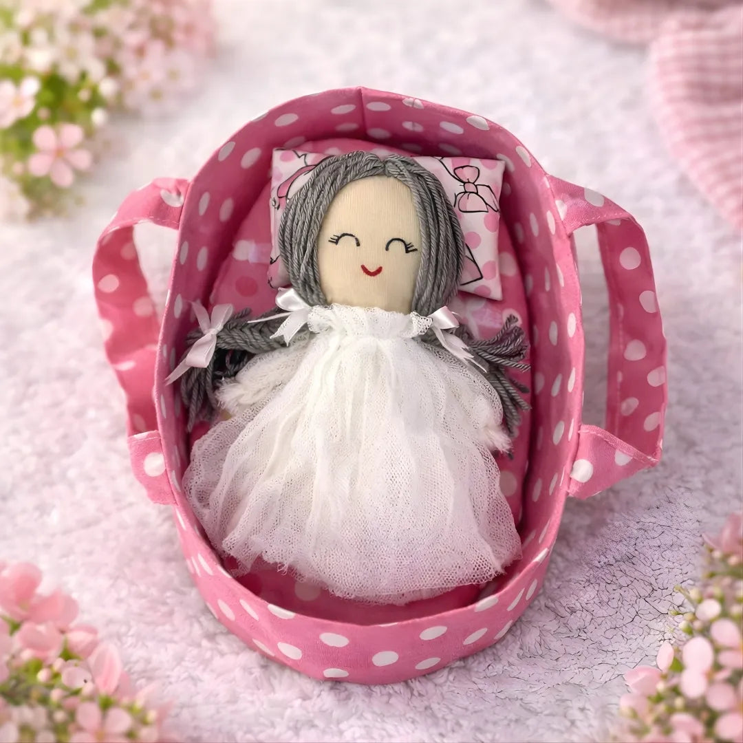 Hand-crafted mini toys designed with toddler safety as the priority. Each doll comes with a charming baby bassinet, offering imaginative play that encourages nurturing and storytelling. Available in three distinct colors to suit different preferences. Constructed from child-safe materials that are easy to wipe clean and maintain, making them ideal for active play and frequent washing. Perfect for developing fine motor skills and fostering creative play in young children.