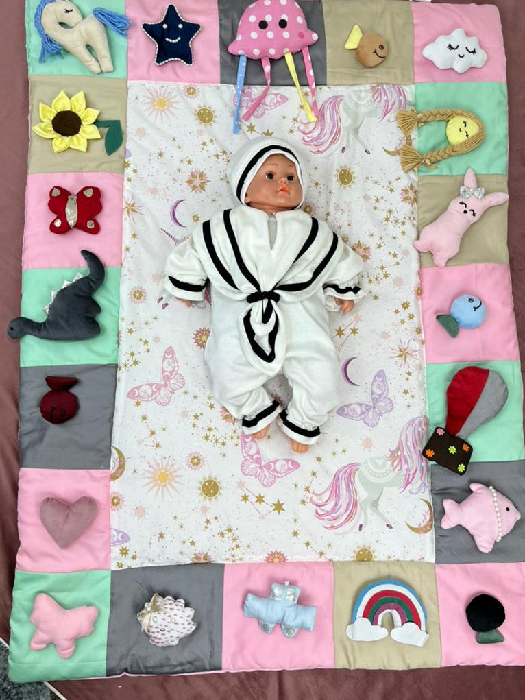 This Baby Playing Mat is made with high-quality fabric, featuring a vibrant and colorful print. It provides a soft and safe surface for your baby to play and explore on. With its durable construction and eye-catching design, it is the perfect addition to any nursery or playroom.
