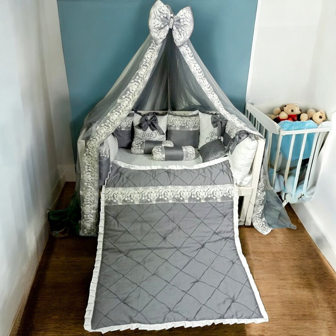 This 11-piece baby cot set is made of luxurious velvet fabric, providing a soft and comfortable sleeping environment for your little one. The set includes all the essentials for a baby cot, ensuring convenience and style for both parent and child. The perfect addition to any nursery.