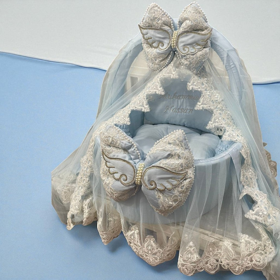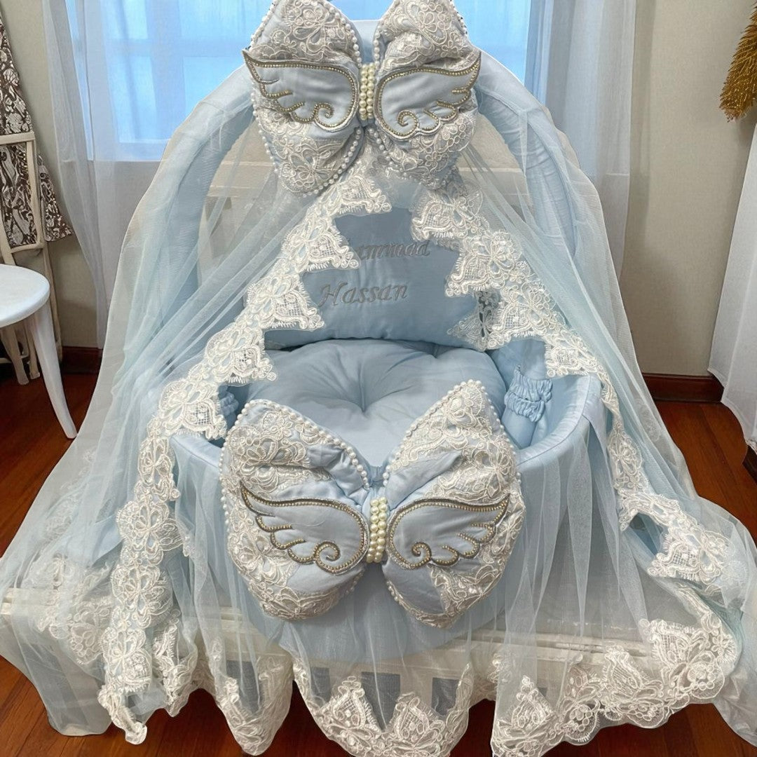 Designed for infants aged 0-8 months, this premium Baby Bassinet provides optimal comfort and protection. Features include a supportive pillow specifically contoured for newborn sleep safety and an integrated mosquito net to shield your baby from insects. The ergonomic design promotes proper spinal alignment while ensuring maximum airflow and visibility for parental monitoring.