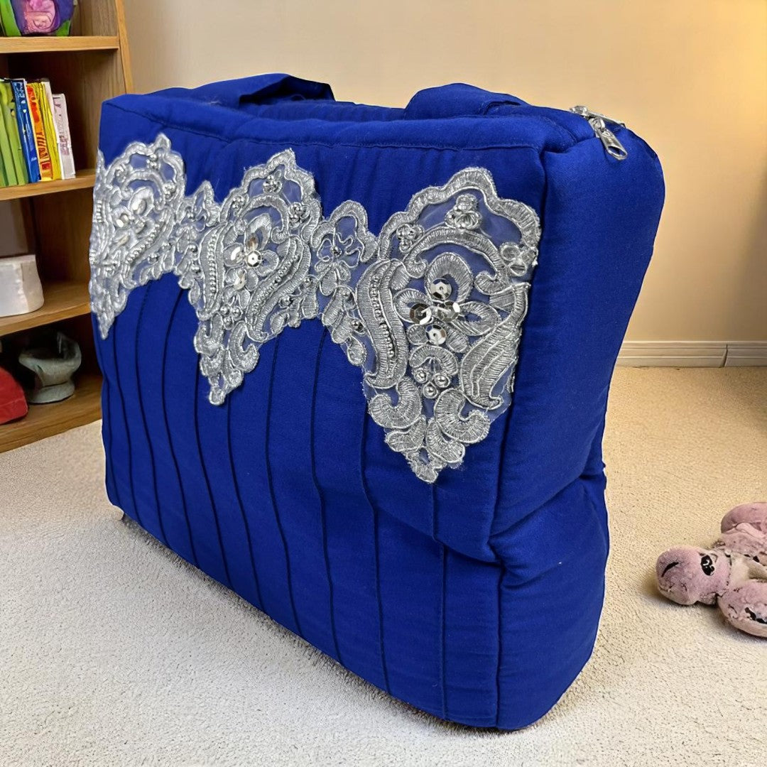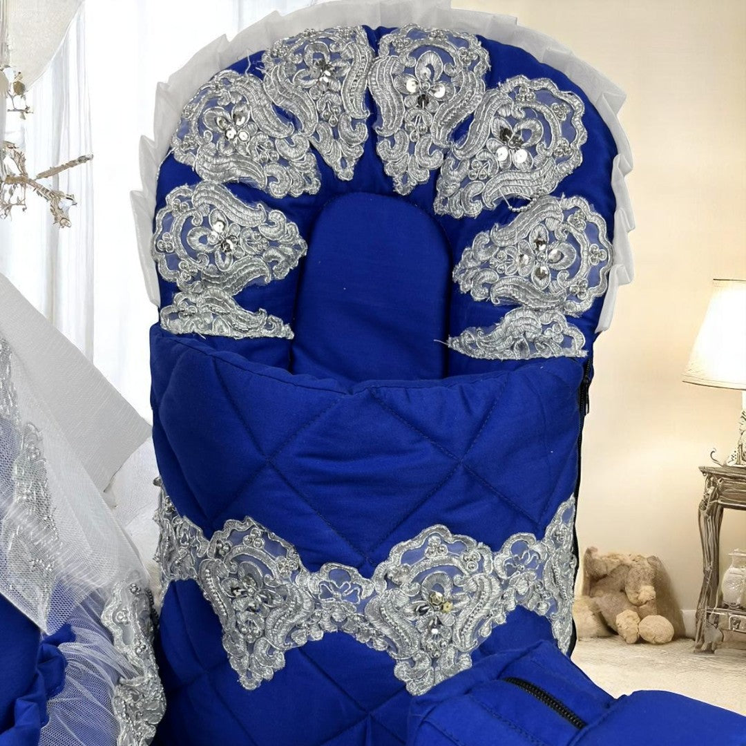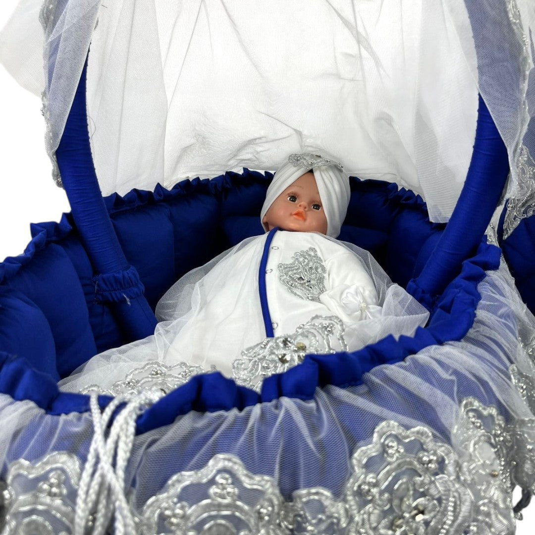 Elevate your baby's comfort with this sophisticated Baby Bassinet featuring an integrated carry nest for on-the-go convenience. Meticulously crafted with elegant silver lace detailing, this bassinet offers a regal aesthetic while providing a secure sleeping environment. The included mother bag offers practical storage for essential items, combining functionality with luxurious design elements worthy of your little royal.