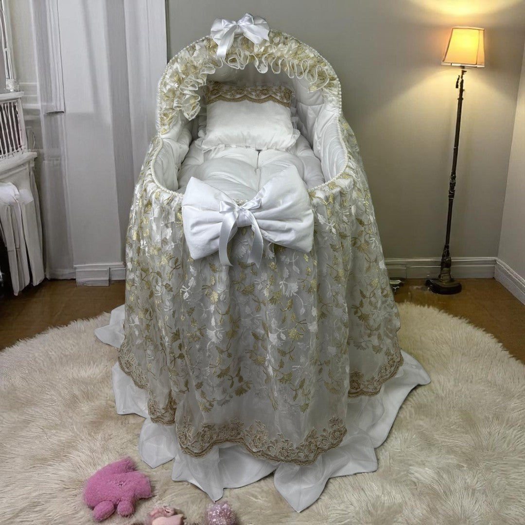 Expertly designed Baby Bassinet with Stand provides optimal comfort for infants 0-6 months. Features a premium mattress for proper support and an elegant curtain surround that adds style while creating a cozy sleeping environment. The sturdy stand ensures perfect height for easy access during nighttime care.