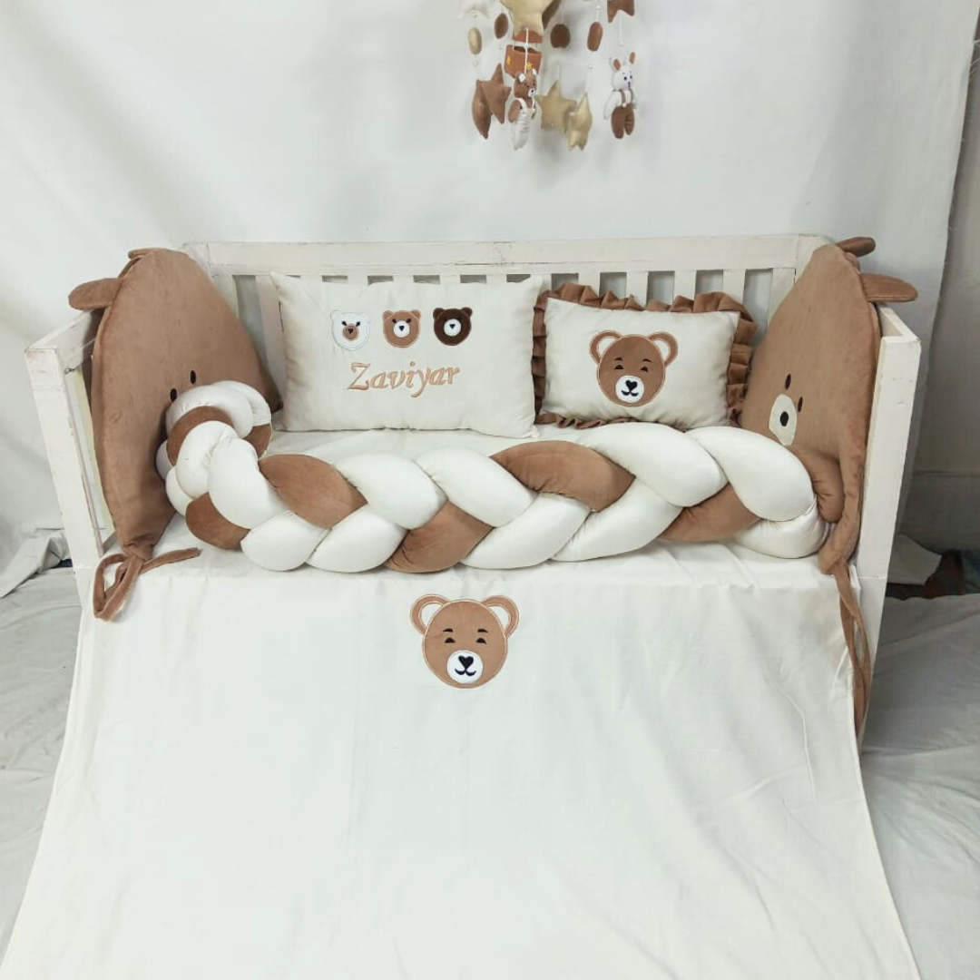 This Bear Cot Bedding Set includes eight carefully crafted pieces designed to provide comfort and style for your little one’s cot. Featuring detailed embroidery and patchwork of a charming bear motif, the set combines durability with a soft, cozy feel. Its expert craftsmanship ensures both aesthetic appeal and practical use, making it an ideal choice for creating a warm and inviting sleep environment. Fabric Cotton Satin
