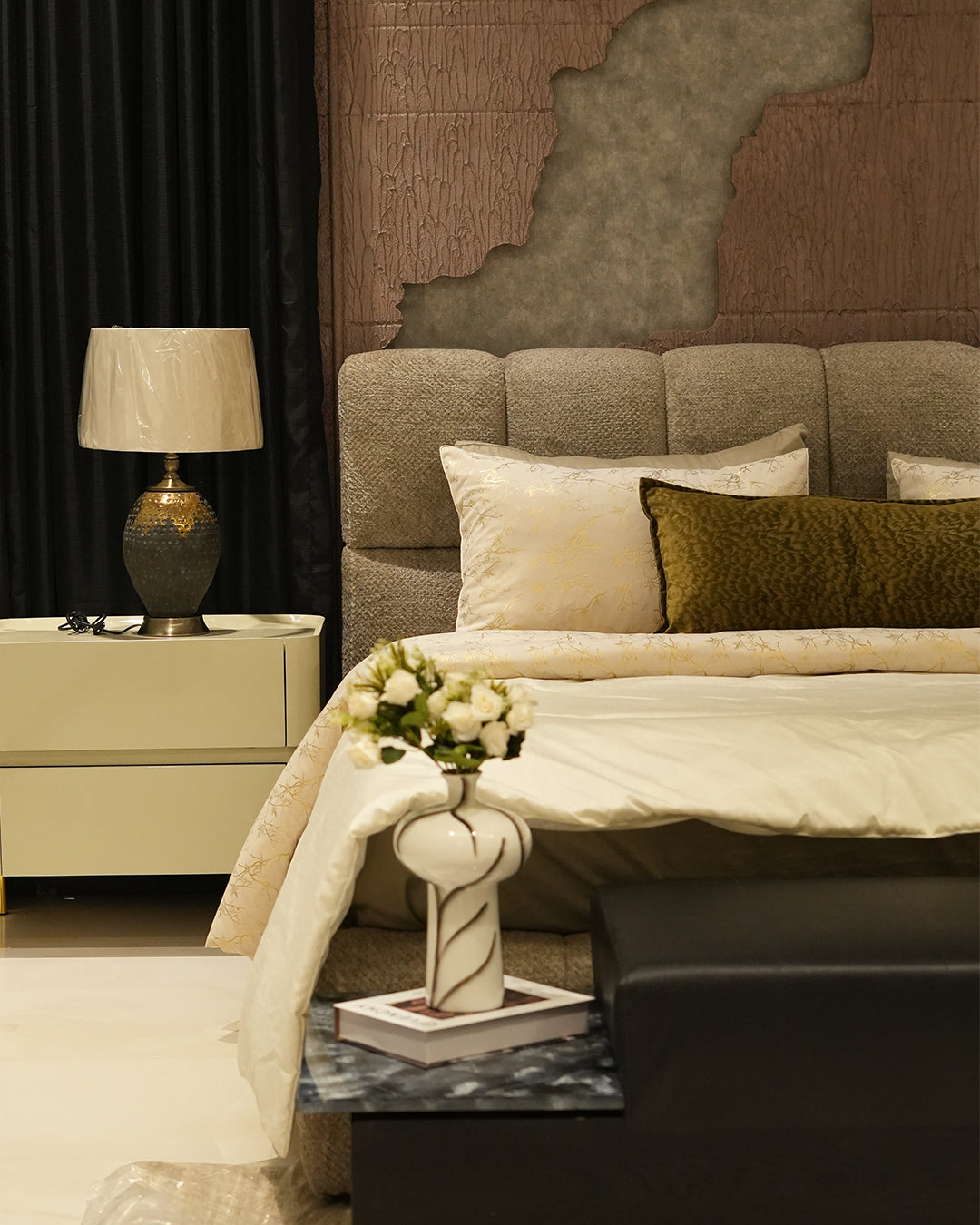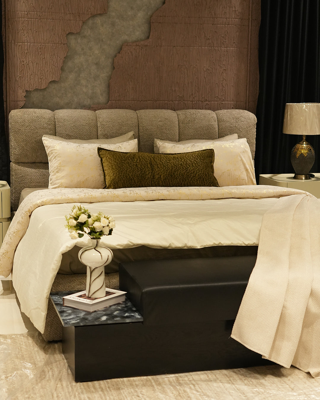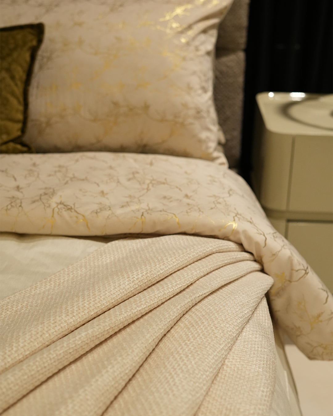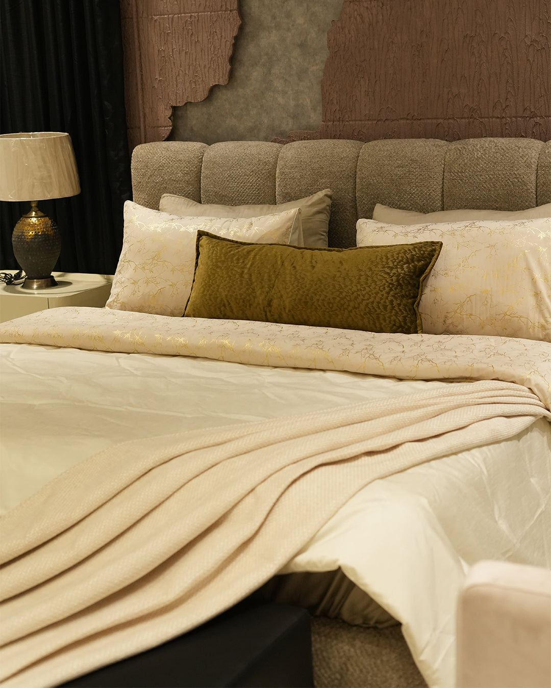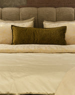 Elevate your bedroom with this sophisticated 7-piece comforter set, crafted from premium cotton satin for a luxurious feel. The serene beige palette creates a calming foundation, while the striking metallic green center cushion adds contemporary elegance and visual depth. Each piece features self-printed detailing that showcases refined craftsmanship without compromising durability. This comprehensive set provides everything needed for a complete bedroom transformation—combining comfort, style, and quality in one curated collection.
