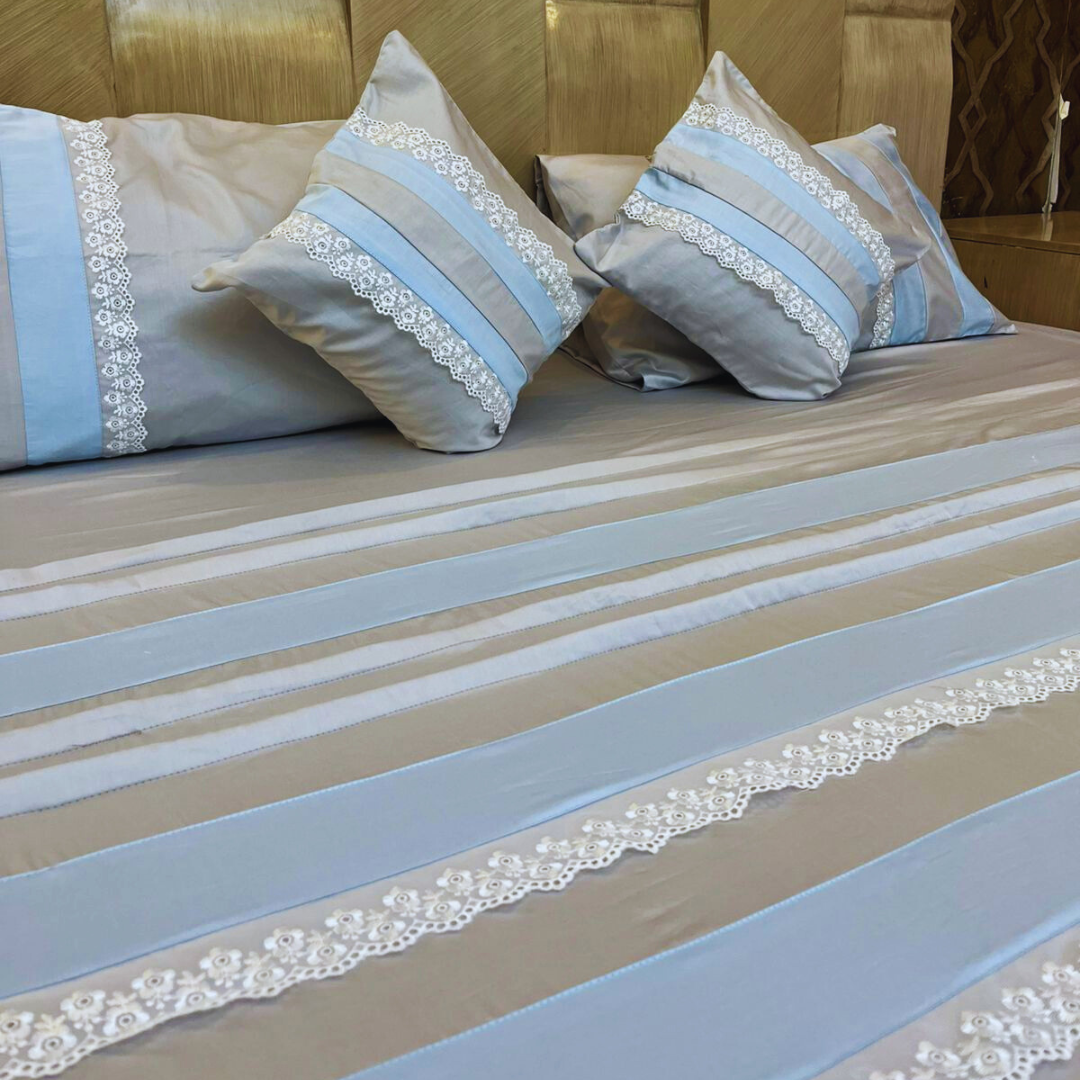 This 5-piece lacy bedsheet set combines elegance and comfort with its lightweight fabric and intricate lace detailing. Featuring delicate light blue patch strips on a steel grey base, it adds a refined touch to any bedroom decor. Designed for both style and breathability, this set ensures a sophisticated and restful sleep environment.Fabric Cotton Satin