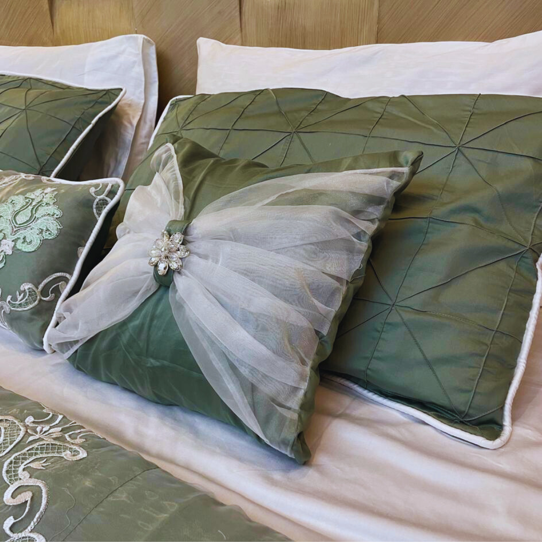 Experience refined elegance with this 9-piece luxury comforter set in a soothing soft green hue. Expertly crafted, it features delicate lace patches that add a sophisticated texture and visual interest. Designed for both comfort and style, this set elevates your bedroom ambiance while providing a cozy, restful experience. Ideal for those seeking a blend of classic charm and modern luxury.