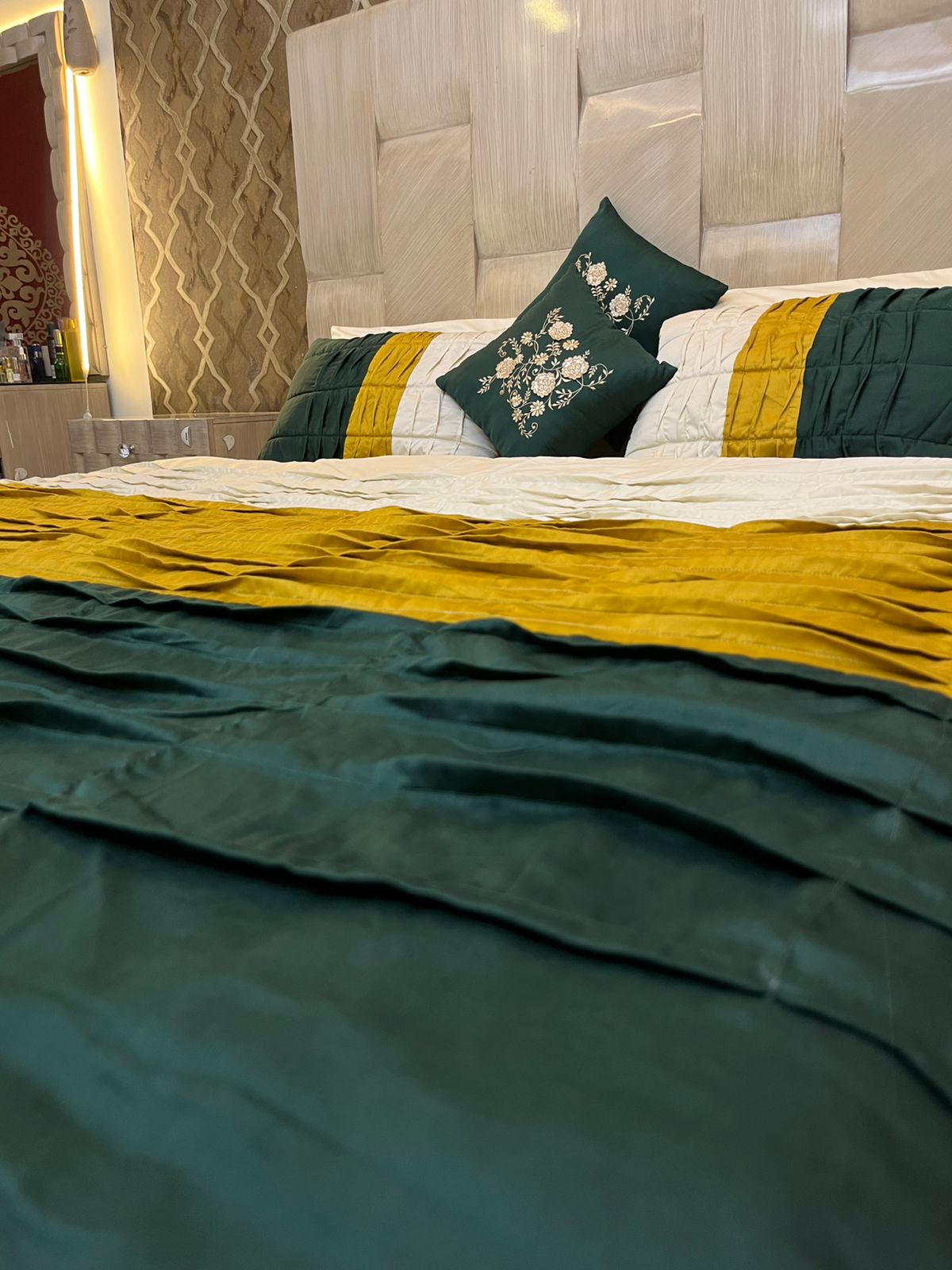 Set Includes 4 Pillow Covers,2 Cushion Covers,1 King Size Bedsheet 102/95 inches, and 1 Comforter Comforter 106/100 inches