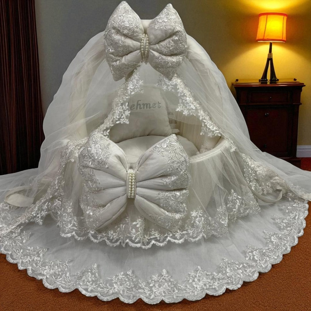 This large baby bassinet is designed to comfortably accommodate infants from newborn up to 7 months. Crafted with soft cotton fabric, it includes a gentle pillow to support your baby's head. Delicate lace detailing adds a touch of elegance while ensuring breathability and comfort. Its spacious size provides ample room for your baby to rest safely, making it an ideal choice for early months.