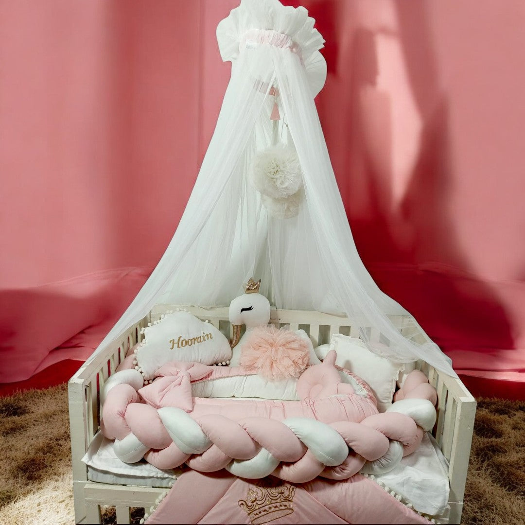 This 9-piece baby cot set is made of luxurious velvet fabric, providing a soft and comfortable sleeping environment for your little one. The set includes all the essentials for a baby cot, ensuring convenience and style for both parent and child. The perfect addition to any nursery.