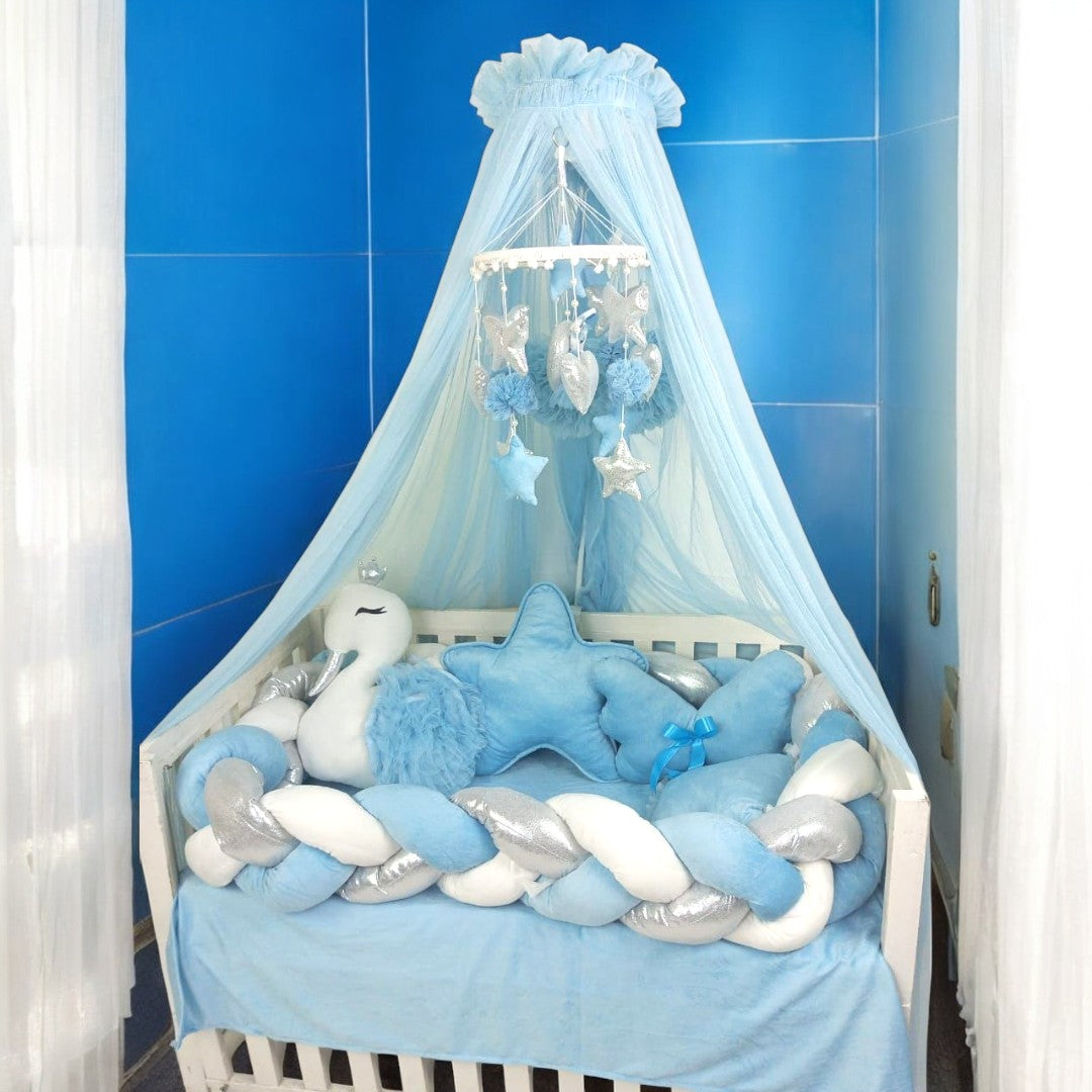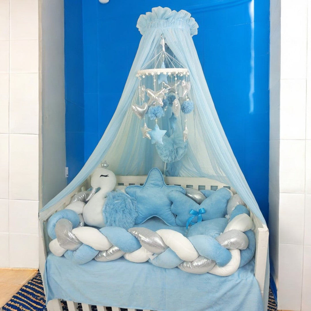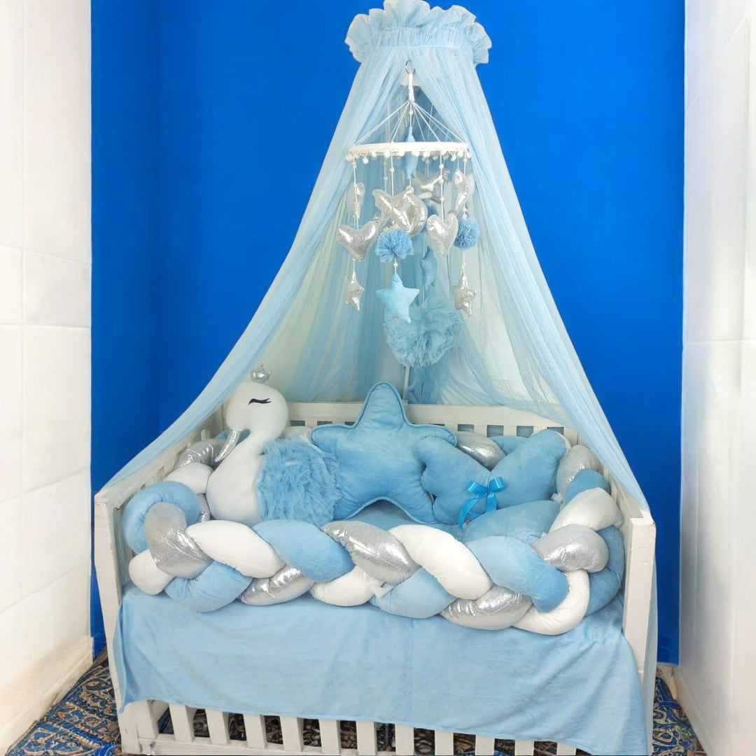 Looking for the perfect bedding set for your newborn's crib? Look no further! Our 8 piece cot set is the ultimate addition to your baby cot. With all the essential pieces, it's perfect for a complete and comfortable nursery. Order now and add our baby cot for a full setup. Limited Stock!
