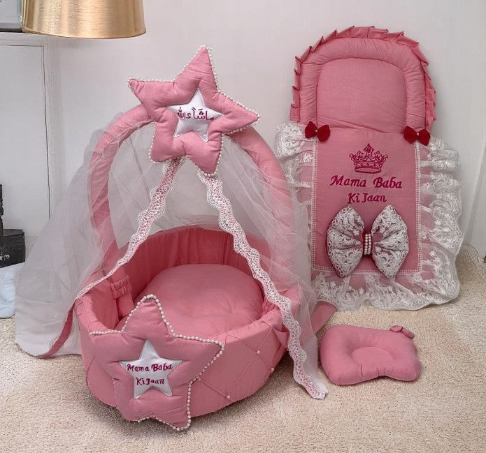 This baby small bassinet set comes equipped with a carry nest and romper set. Perfect for newborns, this lightweight and portable bassinet ensures a secure and cozy environment. The included romper set provides an extra layer of warmth and comfort for your little one. Your baby will be snug and safe wherever you go with this convenient bassinet set.