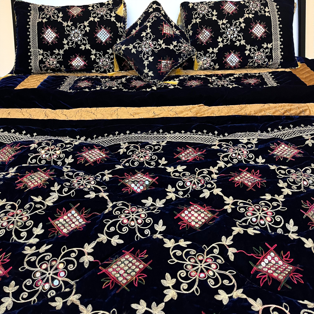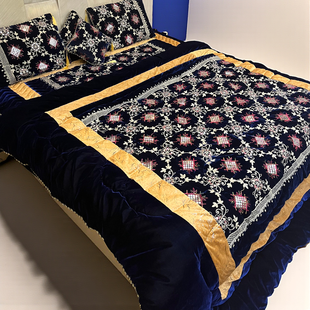 Experience luxury and warmth with our Velvet Quilt BedSheet Sets, perfect for the winter season. This limited stock collection includes a 5-piece set featuring intricate embroidery on a king-sized blue bedsheet, two matching pillows, a decorative cushion, and a fiber-filled quilt. Designed to provide comfort and elegance, this set enhances your bedroom's ambiance while offering cozy warmth during colder months. Ideal for those seeking expert quality and style in winter bedding essentials.
